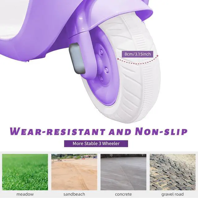 Wheels]: The motorcycle features 3 wheels to provide better balance and stability. Made from durable and wear-resistant materials, your child can ride on various surfaces like concrete and wooden floors, both indoors and outdoors, ensuring a smooth and enjoyable driving experience.