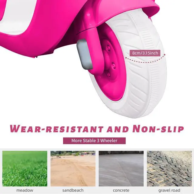 Wheels]: The motorcycle features 3 wheels to provide better balance and stability. Made from durable and wear-resistant materials, your child can ride on various surfaces like concrete and wooden floors, both indoors and outdoors, ensuring a smooth and enjoyable driving experience.