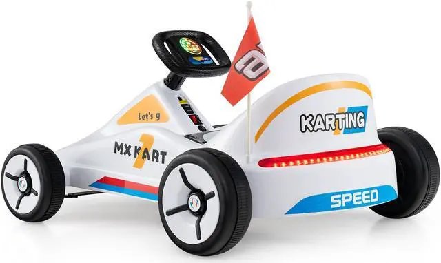 Take Fun Adventures: With 3 flags and bright LED lights, this electric go kart will be an eye-catching presence. The built-in music, story and early education functions enhance playtime, while external devices can be connected via wireless for more entertainment choices.