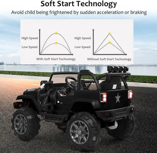 Spring Suspension Wheels and Slow Start: This 12v kids ride on truck comes with rear wheel driven and spring suspension 4 wheelers, which ensures a safer and smoother driving experience for children to avoid the accidental leak or inflate of wheels. Added slow start function with safety harness can protect the kids from being afraid of sudden acceleration or braking.