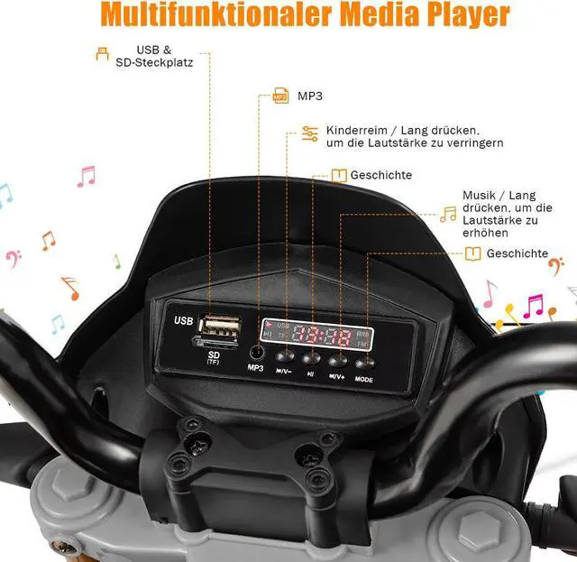 Music and Stories Cheer up Kids: The motorcycle adopts various interesting music and stories to extremely entertaining your kids. Or your kids can listen to their preferred music as long as you connect the music device with USB and MP3 port equipped there. Adjustable volume adds more convenience. In addition, headlight and tail-light are capable of bringing brightness in the darkness.