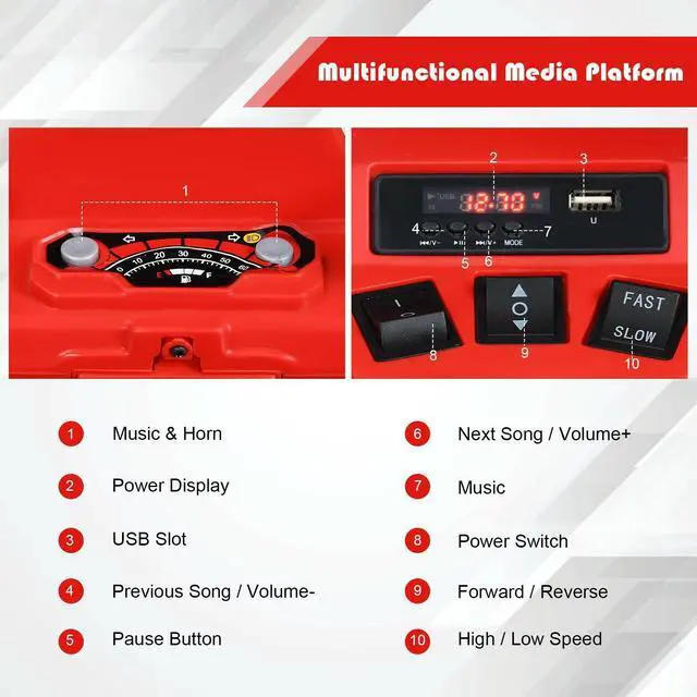 Cheering Music and Story for Infinite Fun: The electric ATV of rechargeable design gives your kids the ability to drive for a long time after a full charge. The power display reminds you to get it changed in time. And there are several music and stories, designed to cheer up your kids so that they will not feel bored. USB slot function make more resources available further.