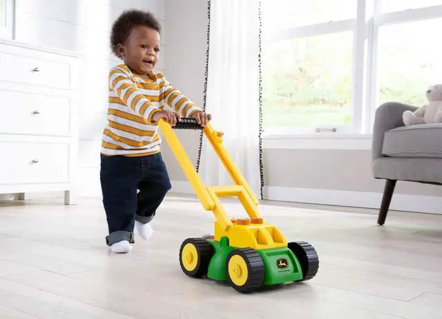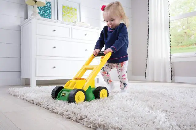 The John Deere Lawn Mower with real sounds lets your child get in on the action and help out around the yard. This lawn mower toy features a voice that prompts your child to check the oil and gas! Kids will love the realistic play watching the rotating grass clippings and spinning grass blade as they help out mom or dad with outdoor work! Button on the mower features its own unique sound. The extendable handle is sized right for your toddler and folds down so that the mower can store flat.