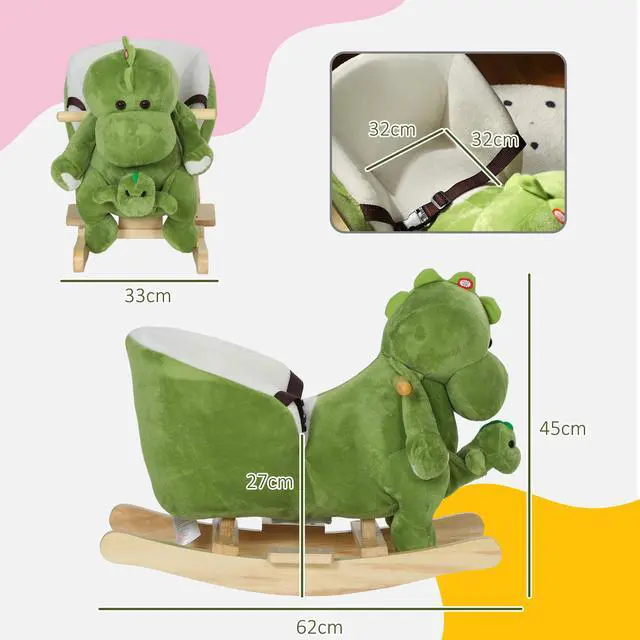 Secure Seating: Equipped with a wide seat, safety belt, and footrest, this rocking horse dinosaur provides a safe ride