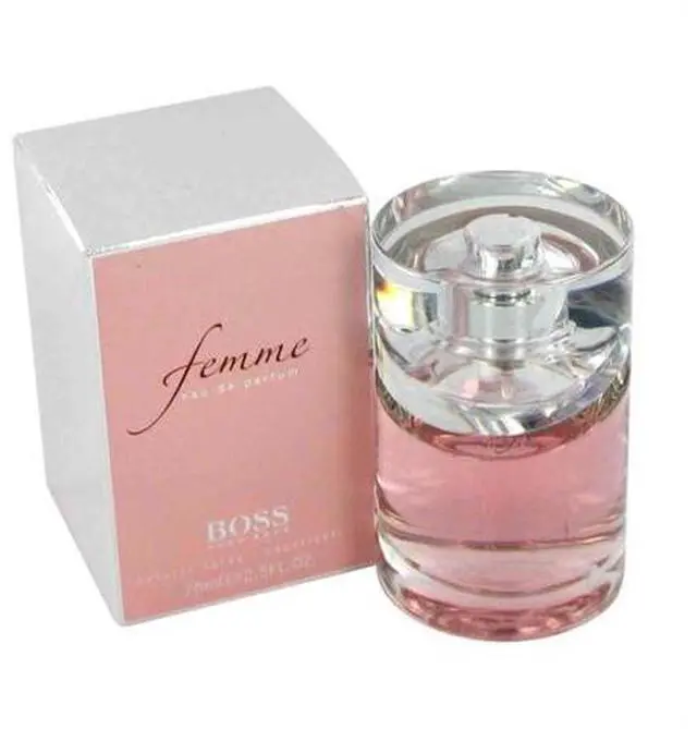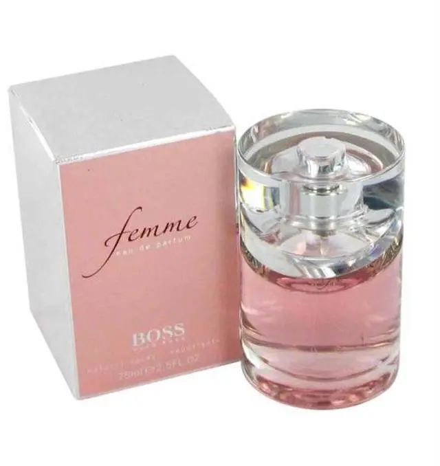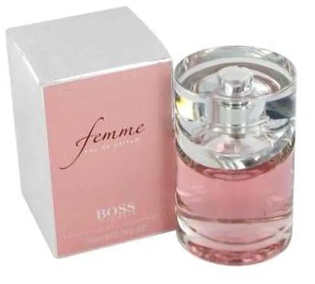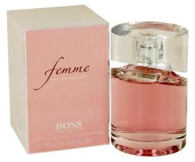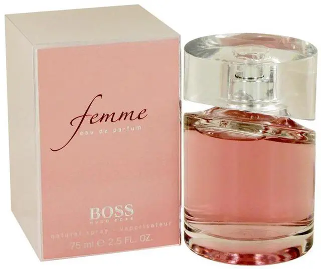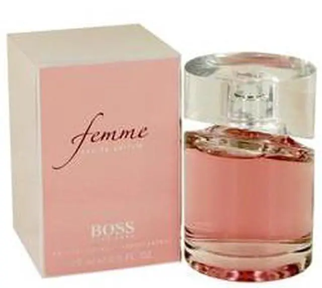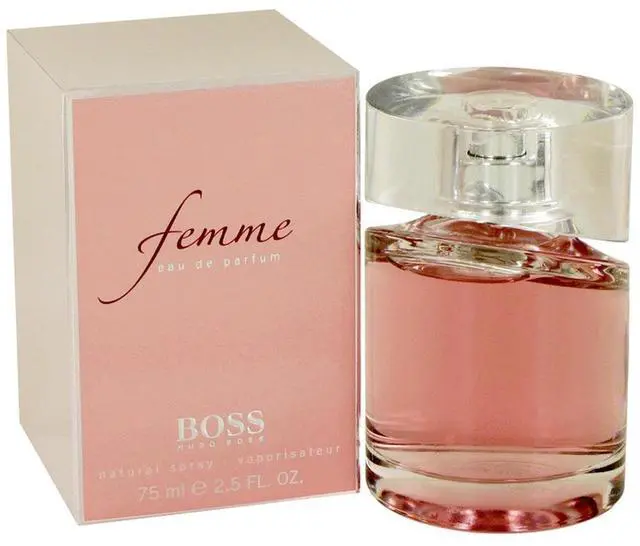 Boss Femme by Hugo Boss Eau De Parfum Spray 2.5 oz for Women Launched in 2006, it opens with tangerine, black current and freesia, then flows into a heart of jasmine and fleur de lys, as well as Bulgarian rose. The base notes include apricot and lemon wood.