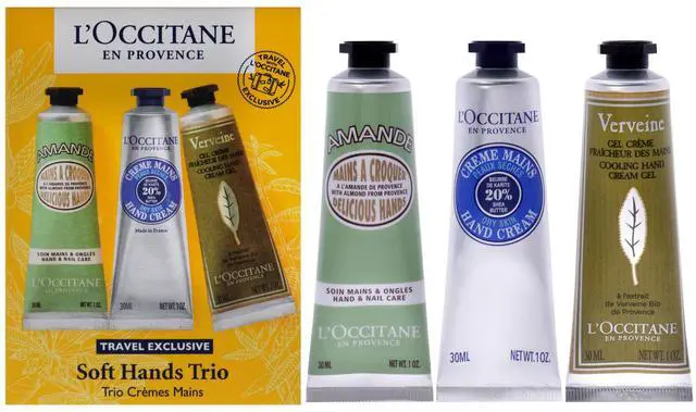 • Soft Hands Trio by LOccitane for Women - 3 Pc 1oz Amande Delicious Hands, 1oz Shea Dry Skin Hand Cream, 1oz Verveine Cooling Hand Cream Gel