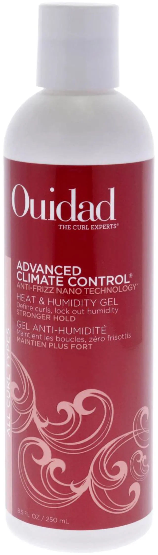 Ouidad's Advanced Climate Control Heat & Humidity Gel-Stronger Hold locks out humidity and defines all curl types with its anti-frizz nano technology. Wheat protein helps reduce hair porosity and tangles, while making strands healthier, shinier and more manageable. Sericin, a protein derived from silk, which seals the hair cuticle to keep out frizz.