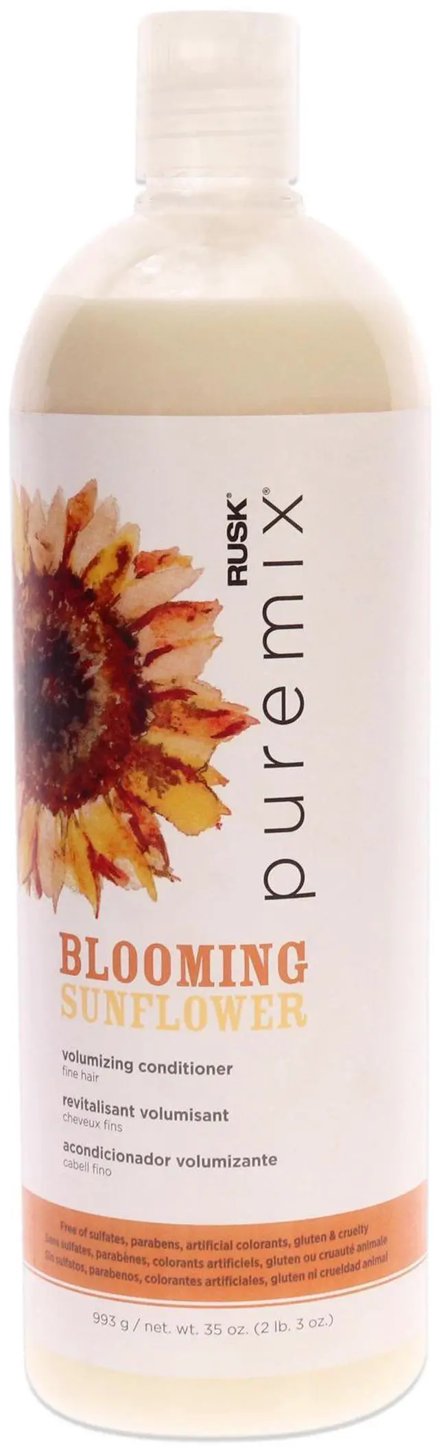 RUSK PUREMIX Blooming Sunflower Conditioner is enriched with sunflower seed extract to gently moisturize hair while protecting color, and vitamin B5 Plus maize to naturally thicken and lift strands. Free of sulfates, parabens, artificial colorants.