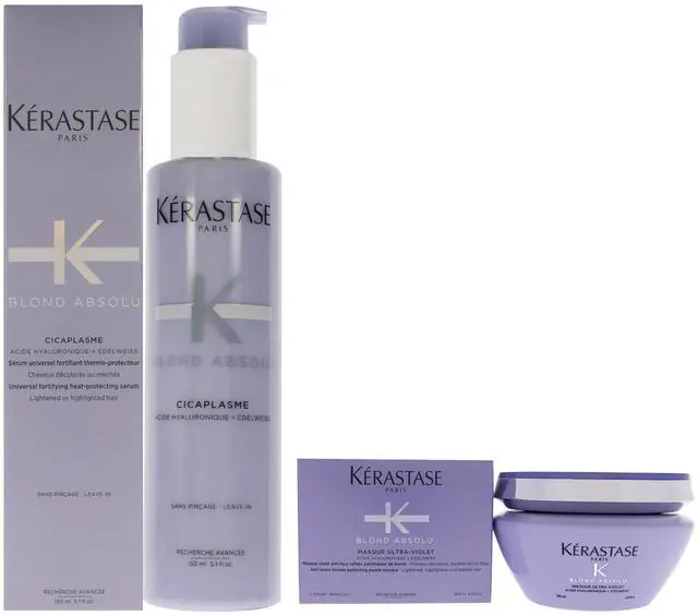 This opalescent lavender-colored leave-in cream fortifies sensitized faux-blonde, lightened, highlighted and grey hair. Enriched with Hyaluronic Acid and Edelweiss flower, Cicaplasme seals split ends and smoothes the hair fiber for a uniform touch and long-lasting frizz control. This rich mask penetrates the fiber to remove unwanted yellow undertones and brassiness, while deeply hydrating and restoring hair strands. This non-staining hair mask neutralize brassy tones and keep your blonde hair luminous and cool. This serum instantly unifies damaged areas of the fiber, provides smoothness and lightness for flawless blonde hair. Its hyaluronic acid-fills and strengthens fiber damage from within and resurfaces cuticle for uniform porosity.