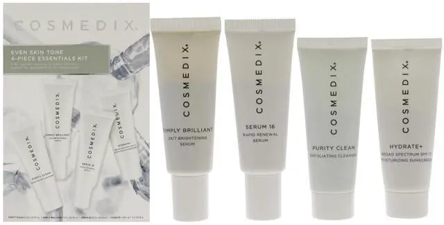 • Even Skin Tone Essentials Kit by Cosmedix for Unisex - 4 Pc 0.5oz Purity Clean, 0.5oz Simply Brilliant, 0.5oz Serum 16, 0.5oz Hydrate Plus