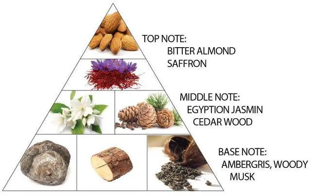 Middle notes - Egyptian Jasmine and Cedar ; Base Notes - Ambergris, Woody Notes and Musk.