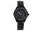 A black stainless steel case and bracelet watch with fixed rose goldtone bezel. It has black dial and Swarovski stones for the bezel Its Black steel strap and crystalset hour markers.
