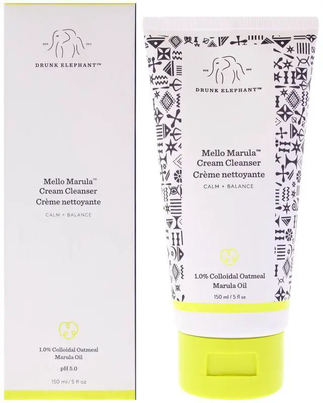 Drunk Elephants Mello Marula Cream Cleanser is an ultra-gentle, low-lather cream cleanser that calms and balances skin as it gently removes water-resistant makeup, sunscreen, and daily pollution. Formulated at a skin-friendly pH of 50
