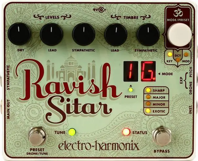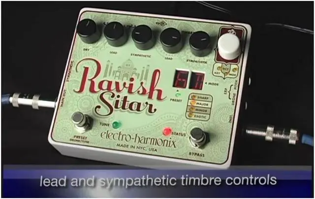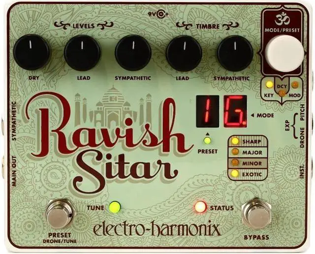 The Electro-Harmonix Ravish is a truly new design with the flexibility to be a crossover tonal wonder. Very few instruments offer as much harmonic and dynamic flexibility as a sitar. Electro-Harmonix has streamlined the essence of the sitar into a compact enclosure that offers a polyphonic lead voice and tunable sympathetic string drones that dynamically react to your playing. Create your own custom scales for the sympathetic strings while you set the decay time for the lead voice. Two expression pedal inputs allow you to bend the pitch of the lead voice and control the volume of the sympathetic strings simultaneously.