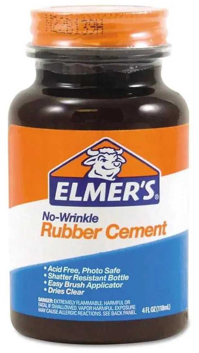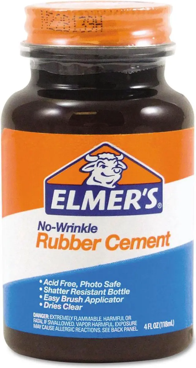 Perfect for scrapbooks and cut and paste projects, No-Wrinkle Rubber Cement permanently bonds items together without causing wrinkles. Elmers No-Wrinkle Rubber Cement is acid-free, photo-safe, and features an easy-to-control brush applicator for precision. Extra glue rubs cleanly away for great results with every use. Bottle with Brush. Adhesive Type: Liquid; Packing Type: Bottle; Washable: Yes; Color on Application: Opaque.