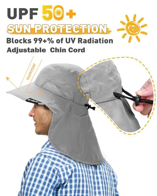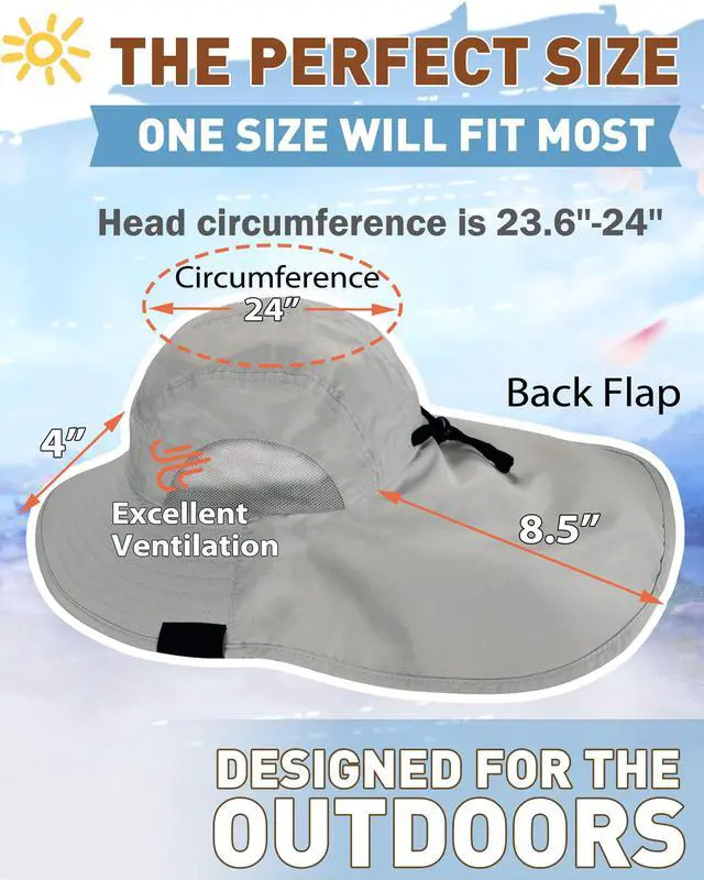 HAT WITH LONG NECK FLAP: 4" wide brim, 24" head circumference, one size fits most adults. Adjustable chin cord keep hat firmly in place in windy. Sturdy front brim and long back flap provide great protection for face, neck and ears from the sun rays