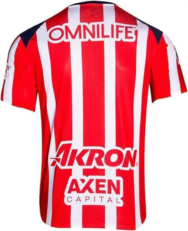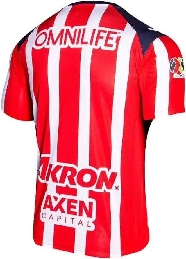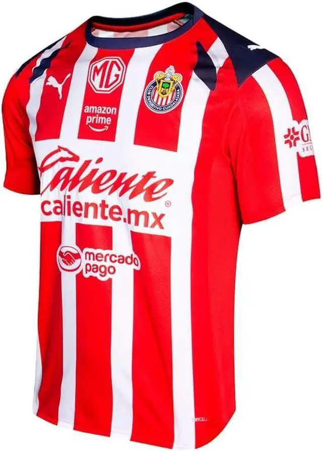 Elevate your game-day style with the official PUMA Chivas Home Promo 25-26 Jersey. Crafted for loyal fans of C.D. Guadalajara (Chivas), this jersey features the iconic red & white vertical stripes that define the clubs legendary identity, paired with modern navy accents on the collar and shoulders. Engineered with PUMAs dryCELL moisture-wicking technology, the lightweight, breathable fabric keeps you cool and dry whether cheering in the stands, training, or enjoying casual everyday wear.The structured collared design and premium dobby material deliver a polished, athletic fit, while the embroidered Chivas crest and PUMA Cat logo showcase authentic team pride. Complete with official sponsor graphics, this short-sleeve jersey blends timeless heritage with performance innovationperfect for showing unwavering support for Chivas in Liga MX and beyond.