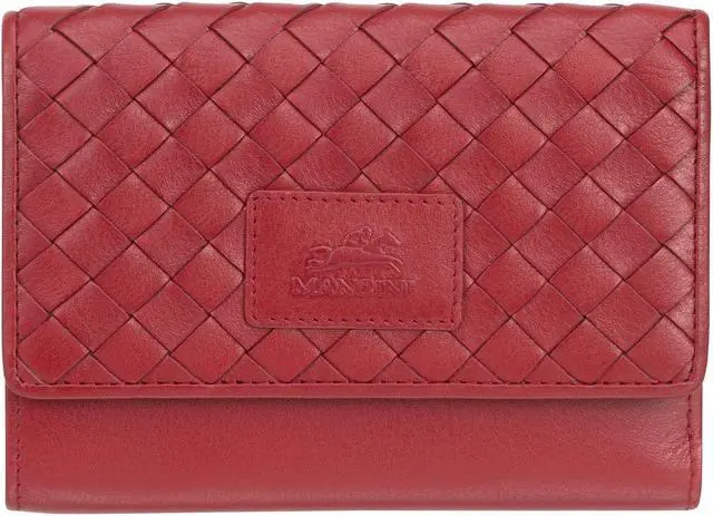 A fashion statement. Our Basket Weave Collection uses a premium full grain leather with a basket weave design and our finest craftmanship. Accented with polished hardware. An extensive range of contemporary styling wallets and personal accessories for the most discerning woman. This trifold wallet features numerous card slots as well a rear zippered coin pocket. The wallet is secured by a flap with button closure. This wallet is also featuring the latest RFID wave blocking technology to ensure your data and cards are safe.