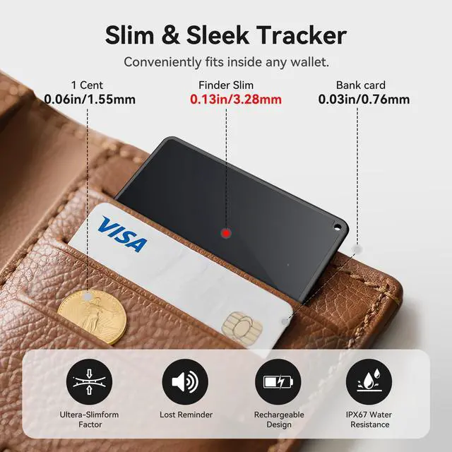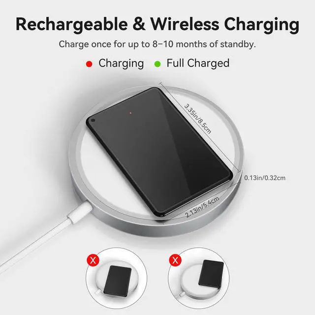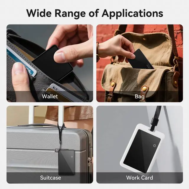 Easy Connection with Apple Find MyJust open the Find My app, pair wallet card tracker with your device, and tracking card will help you locate your wallet, handbag, bag, luggage, and more. A practical gift for Father's Day, Birthday. Loud Ring for LocationOpen the Find My APP, tap the Play Sound button, and the air tracker card will beep as long as it is within Bluetooth range. The wallet tracker card's beeps help you quickly locate lost keys inside couches, bags, or wallets. Wireless Recharge Smart TagOur tracking device is wirelessly rechargeable. A full charge provides up to 8-10 months of standby time, though actual battery life may vary depending on usage. Ideal for trips and more eco-friendly by reducing waste. Remarkably Slim & Rugged DesignThe air tracker card Slide into slim wallets, backpack, luggage tags and cardholders without bulk. Water & dust resistant design ideal for outdoor activities like hiking, beach trips, or heavy rain. Lost Mode & Sharing ModeUse the Share Device feature in the app to allow up to 6 users (plus yourself) to view the tag's location. Smart Tracker with Encrypted Lost Mode for Effortless Item Recovery. Assured data security. This tracker tag cannot be paired again if lost or stolen.