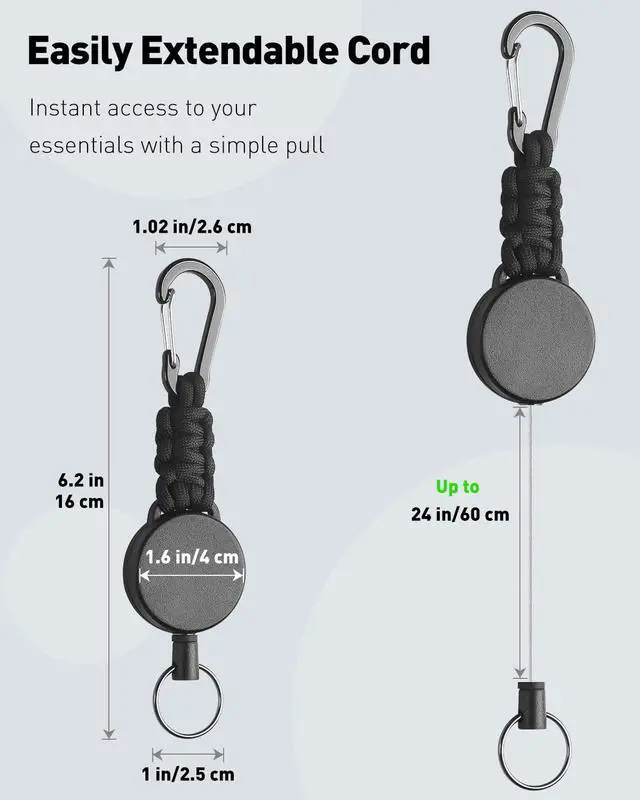 Strong 1 mm Steel Cord: Crafted from 1 mm tough steel, the cord extends up to 24 inches, giving you quick access to your essentials. Its corrosion-resistant PVC coating greatly minimizes friction, ensuring a smoother and more effortless glide every time