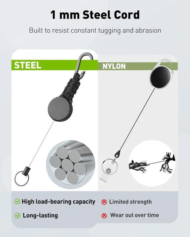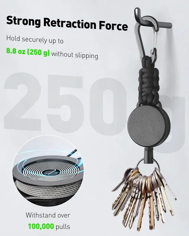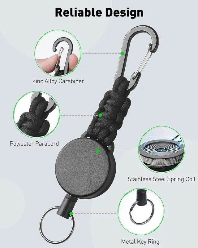 Heavy Duty: Constructed with a rugged ABS casing and 550 military-grade Polyester paracord, this retractable keychain is built to endure dragging, abrasion, impacts, and frequent drops. Exceptionally tough and dependable for the demands of everyday use