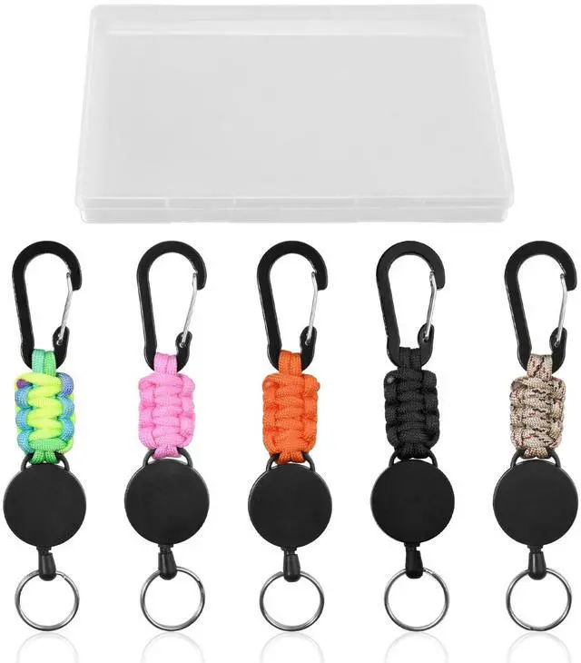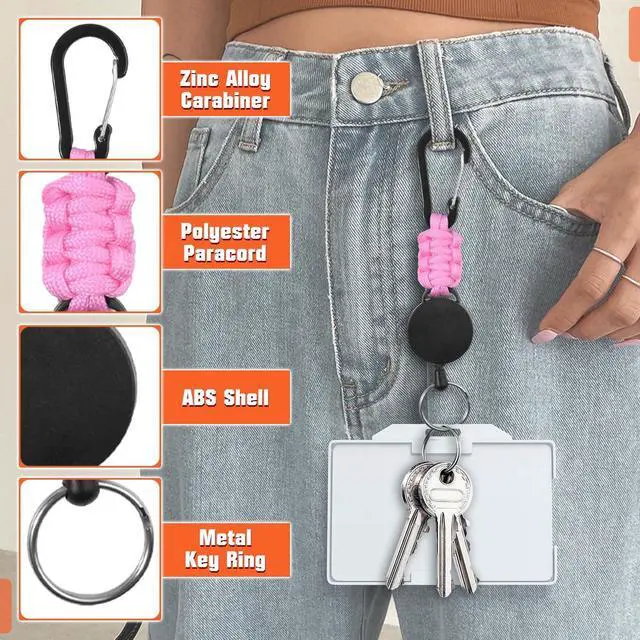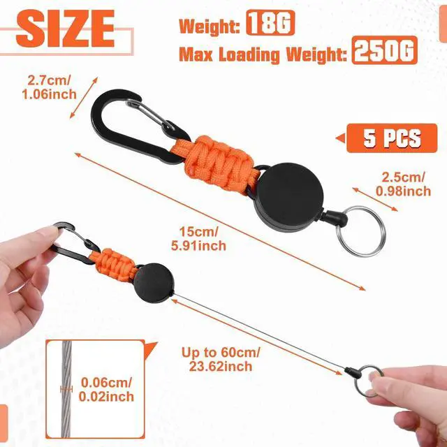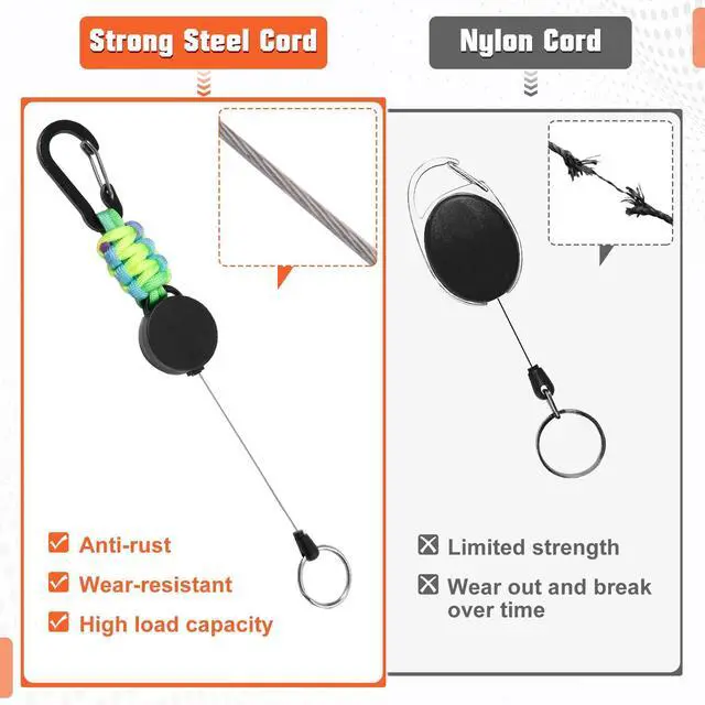 Premium Materials: Crafted from lightweight yet robust ABS housing, tear-resistant woven parachute cord, rust-resistant PVC-coated steel cord with reliable strength, this retractable keychain is built to be an essential accessory for your outdoor adventures