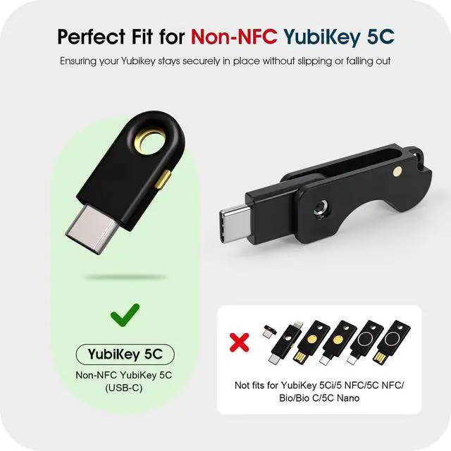 Compatible ONLY with Non-NFC YubiKey 5C (USB-C) Specifically designed for the standard YubiKey 5C USB-C version without NFC. Not compatible with YubiKey 5C NFC, 5Ci, 5 Nano, or any other models.