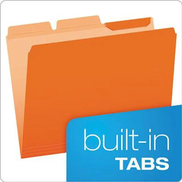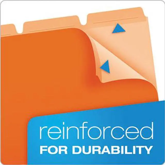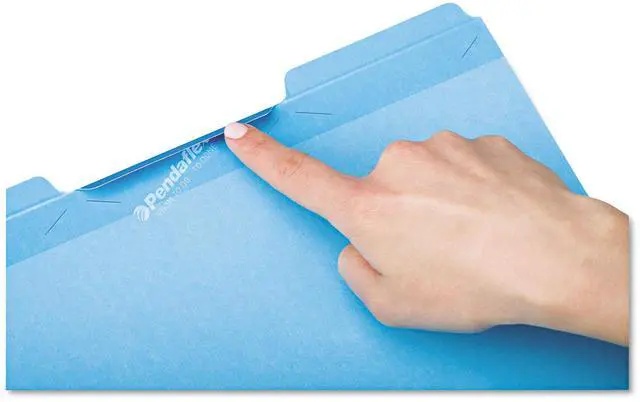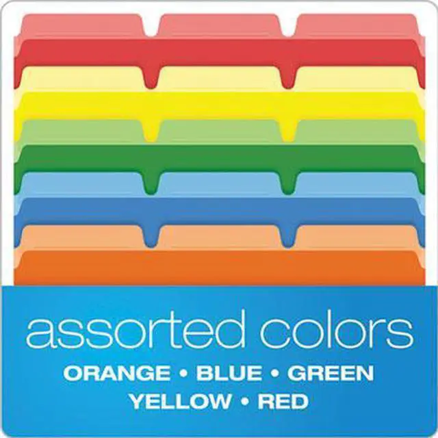 Pendaflex Ready-Tab File Folders feature built-in tabs for faster file setup. Standard 11 pt. folders with 3 poly-reinforced tabs. Folders come with all three tab positions - choose the one you want and fold the others out of the way. Letter size. Assorted colors: blue, yellow, red, bright green, orange. Paper made from 10% recycled fiber with 10% post-consumer fiber. 50/Box.