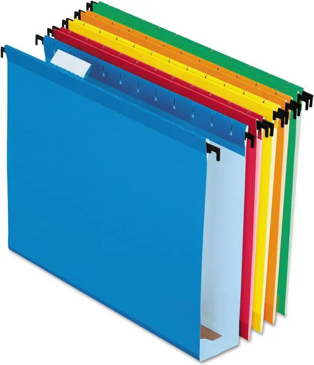 Keep documents protected with these reinforced hanging folders. Featuring pressboard inserts, these folders can expand up to 2 inches, so they can easily contain up to 400 sheets of paper. These Pendaflex SureHook letter-size 1/5-cut extra-capacity hanging folders have longer hooks and tension springs, so they can slide along rails smoothly, while the various bright hues allow for convenient color-coding.