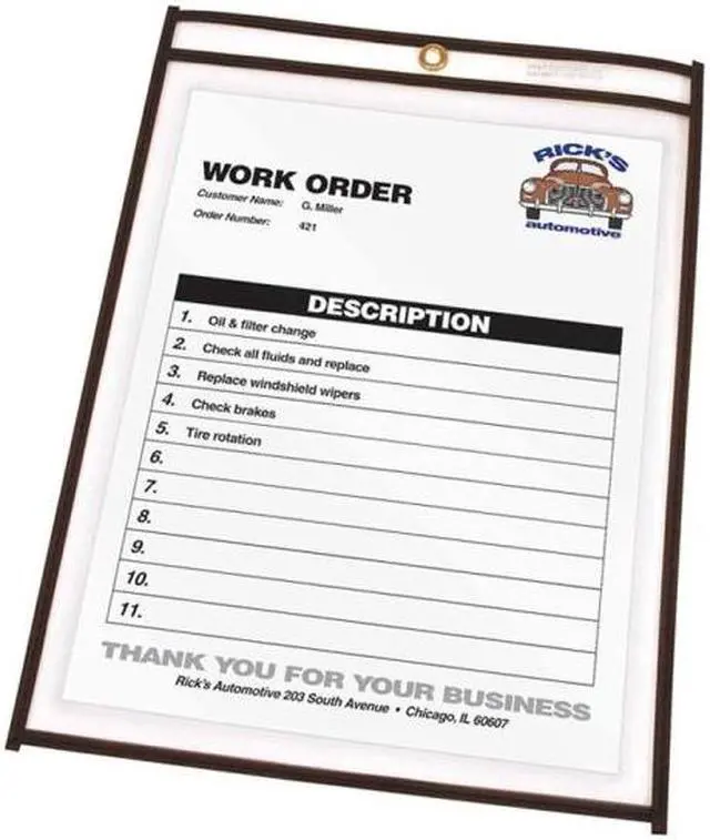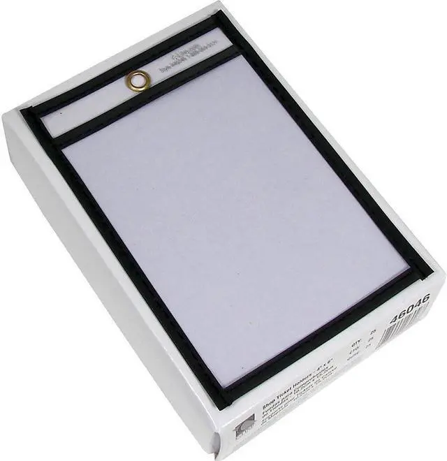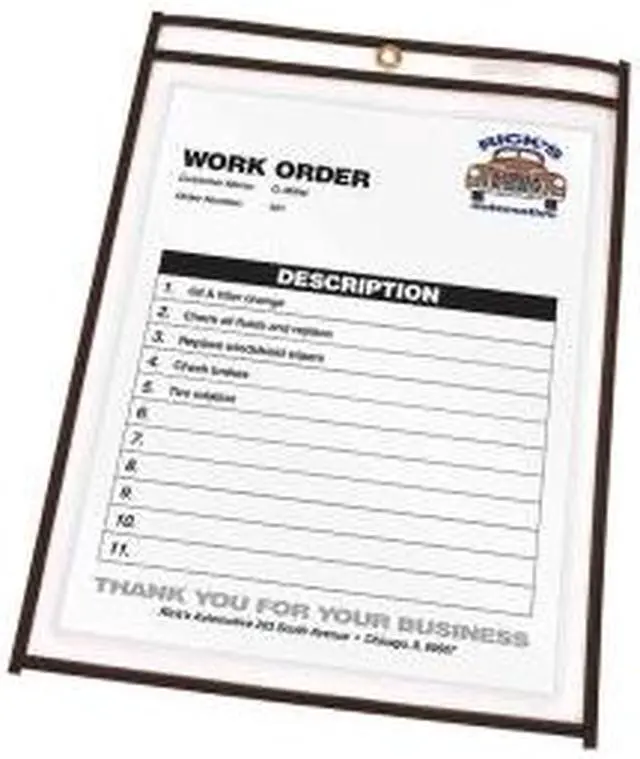 Store and protect work orders, production schedules, inventory cards and more in these stitched, shop ticket holders. Strong, rigid, clear vinyl allows easy visibility of documents. Convenient eyelet at top allows hanging. Reinforced stitched edge delivers longer product life. Both sides are clear. Holders open on short side.