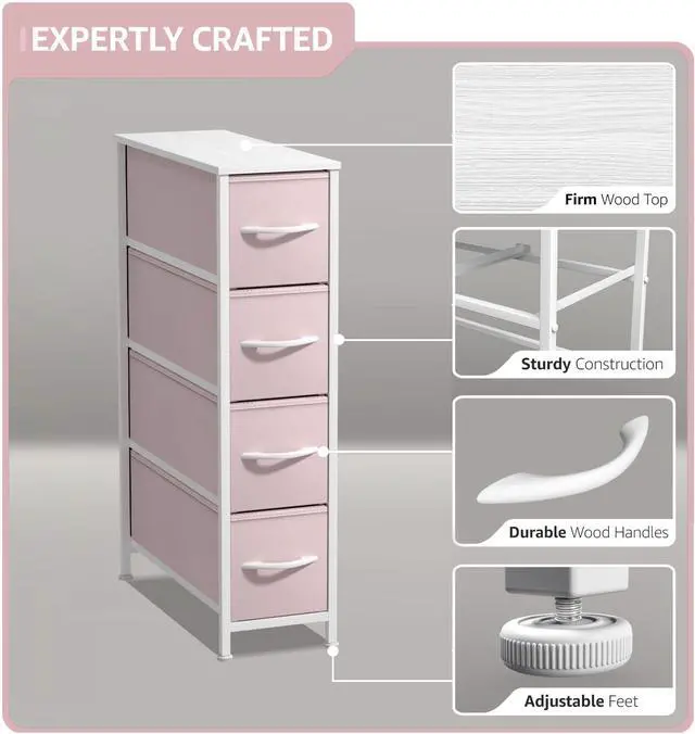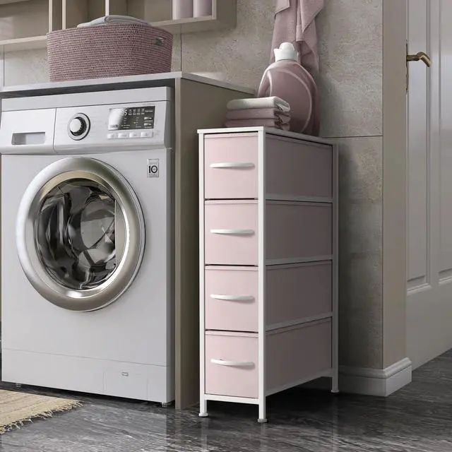 Give household essentials a cozy landing spot with the Sorbus 4-Drawer Storage Tower. Make the most of every inch in your home with this slim storage tower, complete with a tabletop surface and pull-out drawers. The vertical design is ideal for small living spaces and works equally well in a bathroom or bedroom. Store and display anything from linens, supplies, and everyday clutter. The lightweight frame makes this tower easy to transport and when not in use, simply fold the fabric drawers flat for storage. Use alone as a single unit or pair with any drawer configuration from the Sorbus Furniture Collection. With everything you need right by your side, getting organized has never looked better! Maximize space around any home, small apartment, or college dorm for instant storage. Perfect for that narrow space, this versatile drawer tower can be used in any corner of the home. Fill wasted space in the bathroom between the tub and sink or in the laundry room between the washer and dryer. For extra storage in the bedroom, use it as a nightstand for your lamp and bedside necessities. The strong narrow drawers are deep enough to hold accessories, baby clothes, toys, laundry & knitting supplies, gadgets, toiletries, and much more. The possibilities are endless! This unique storage solution is easy to set-up with minimal assembly required. Showcasing a vertical style design, this 4-drawer tower is portable, lightweight, and easy to assemble. Hardware and instructions INCLUDED. Each removable drawer includes a built-in carry handle and made of breathable, non-woven fabric for soft-closing storage. Frame made of steel. Tabletop surface made of MDF wood with smooth finish. Wipe clean. Suits most home décor. Available in different drawer configurations and color options. Measures approximately 7.87 L x 19 W x 29.87 H.
