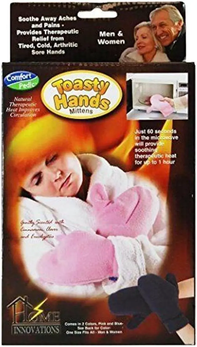 Home Innovations Comfort Pedic Toasty Hands Heated Mittens Pink or Blue. Adult Size. Features built-in heating elements for toasty hands. Perfect for outdoor activities in cold climates. An ideal gift to keep hands warm during winter outings. One Size Fits All. Pink & Blue