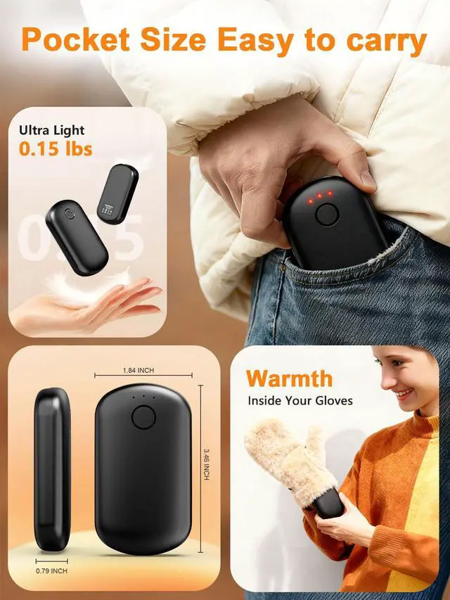 Experience instant warmth and comfort with our rechargeable hand warmers, designed to keep your hot hands cozy anytime, anywhere. This 2-in-1 compact set includes two units that can be used separately or combined for full-palm heat. Each unit is lightweight, pocket-sized, and portableperfect for outdoor adventures, daily commutes, or indoor use. Our electric hand warmers heat up in just 2 seconds, offering 3 adjustable temperature settingslow, medium, and highreaching up to 131. With intelligent temperature control, these rechargeable hand warmers provide steady and safe heat without overheating. Built-in safety features protect against overcharge and short circuits, giving you peace of mind with every use. Equipped with a powerful 6000mAh battery, this rechargeable hand warmer fully charges in 45 hours and delivers up to 20 hours of continuous warmth. Ideal for long hikes, camping, skiing, fishing, or daily routines, it ensures your hands stay warm all day without frequent recharging. Featuring a sleek, modern design with an ergonomic grip, these hand warmers rechargeable are both functional and stylish. Simple one-button control allows you to switch between heat levels effortlessly, while the smooth, ergonomic shape fits naturally in your hand. Perfect as a thoughtful gift, these rechargeable hand warmers are ideal for family, friends, or loved ones on Christmas, Thanksgiving, birthdays, or Valentines Day. Whether for outdoor activities or indoor relaxation, they bring warmth, comfort, and care in every use.