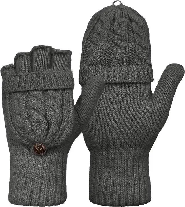 Tanvia Winter Fingerless Gloves Mittens for Women Men Warm Wool Knitted Convertible Flip Top Mittens for Cold Weather, Dark Gray