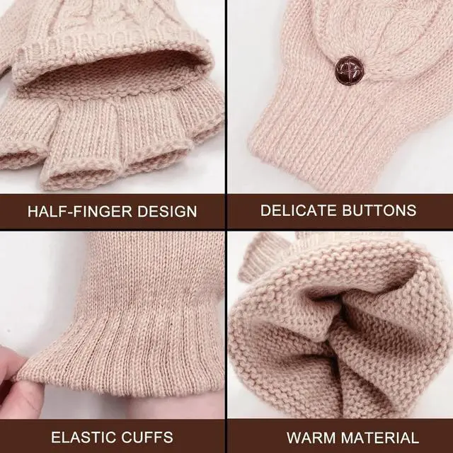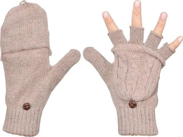 Tanvia Winter Fingerless Gloves Mittens for Women Men Warm Wool Knitted Convertible Flip Top Mittens for Cold Weather, Light Coffee