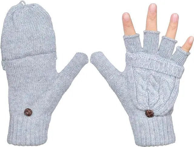 Tanvia Winter Fingerless Gloves Mittens for Women Men Warm Wool Knitted Convertible Flip Top Mittens for Cold Weather, Light Gray