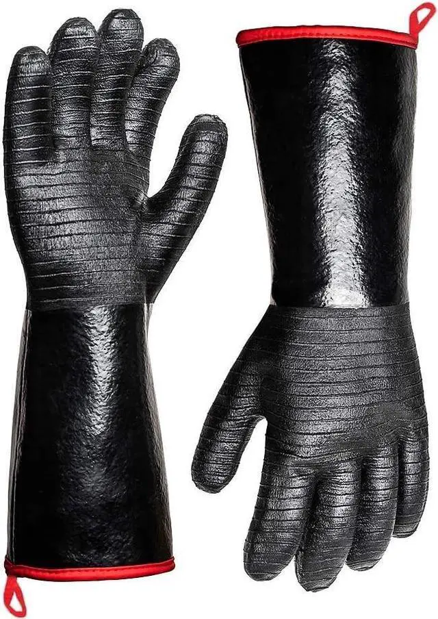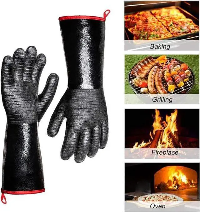 - SAY GOODBYE TO BURNS! At 14” inches long, our BBQ gloves better protect fingers, hands and wrists from burns. And Our cooking gloves are heat resistant up to 932°F / 500°C .use this bbq accessories for your turkey fryer ,campfire,fireplace,charcoal,pit & barbecue gas grills as well