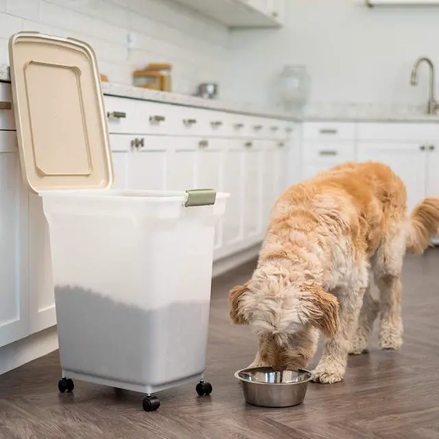 The IRIS premium airtight pet food container is translucent, versatile, functional, and can be used in any area of the house. Made in the USA. Fda-compliant and BPA-free material.