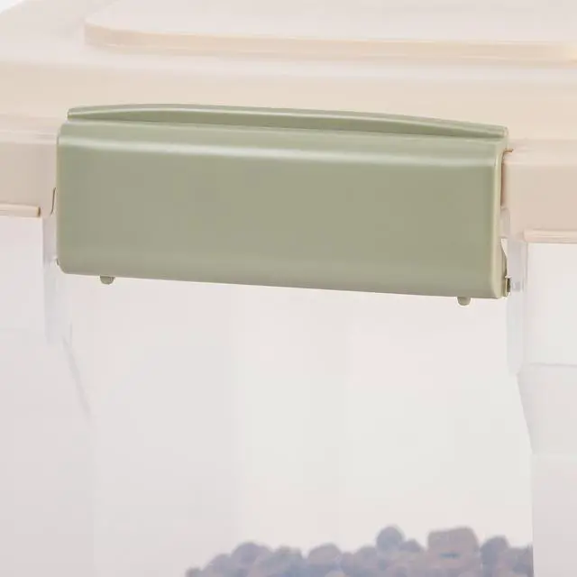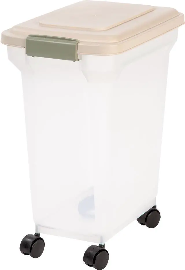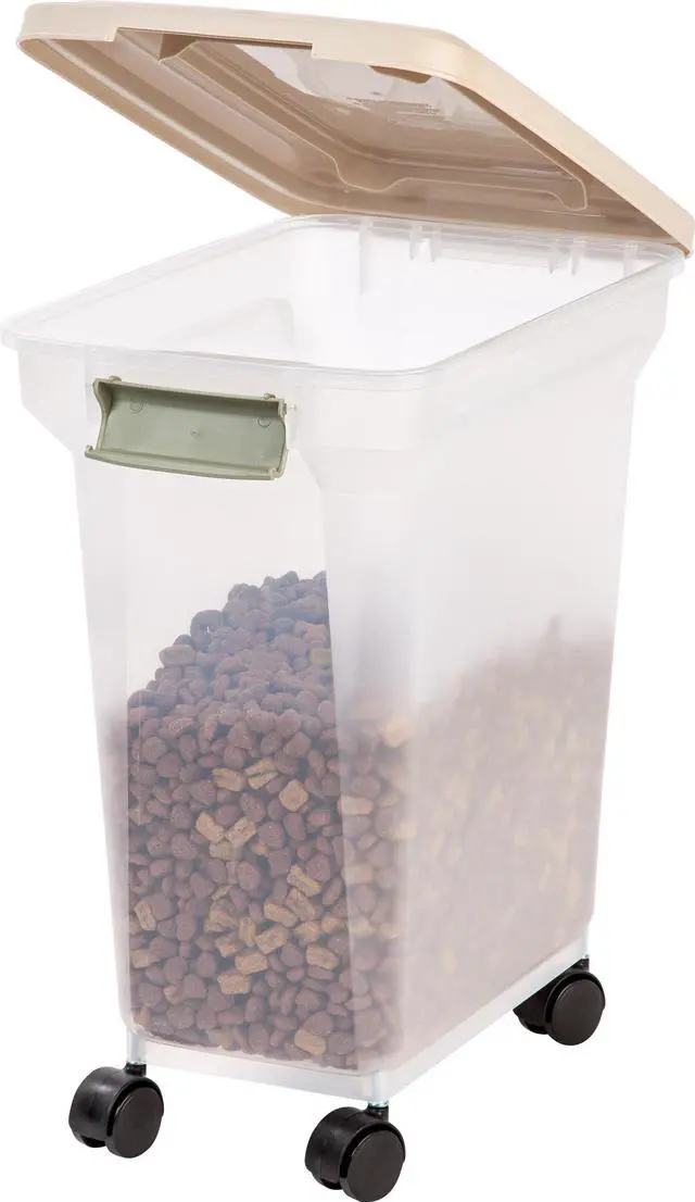 The IRIS Premium Airtight Pet Food Container is translucent, versatile, functional, and can be used in any area of the house. Made in the USA. FDA-compliant and BPA-free material.