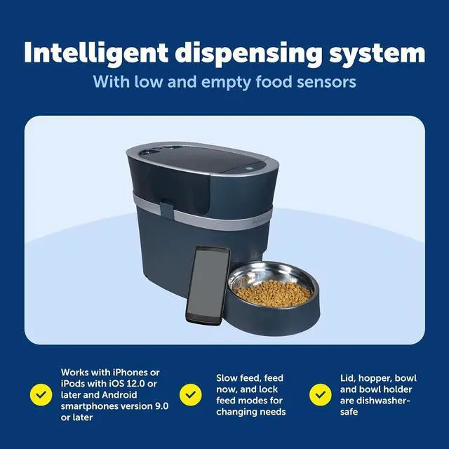 REMOTE MONITORING: With the automatic dog feeder, you can monitor your pet's meals from anywhere using the My PetSafe app (requires an iPhone or iPod device iOS 12.0 or later or a compatible Android smartphone 9.0 or later). This automatic pet feeder allows you to adjust meal sizes and receive notifications when the feeder is running low.