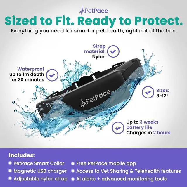SUBSCRIPTION REQUIRED Plans sold separately. Monthly $29, Yearly $25/m billed $300 then $200/yr, 2-Year $16.70/m billed $400 then $200/yr, 3-Year $13.90/m billed $500 then $200/yr) enables PetPace AskaVet, Share With Your Vet, AI-powered health insights, GPS tracking, and wellness alerts. Features require active cellular or Wi-Fi connectivity. Full functionality is supported in the USA & Canada; limited operation via Wi-Fi in other regions. Also available for dogs with advanced condition-specific monitoring and multiple size options.