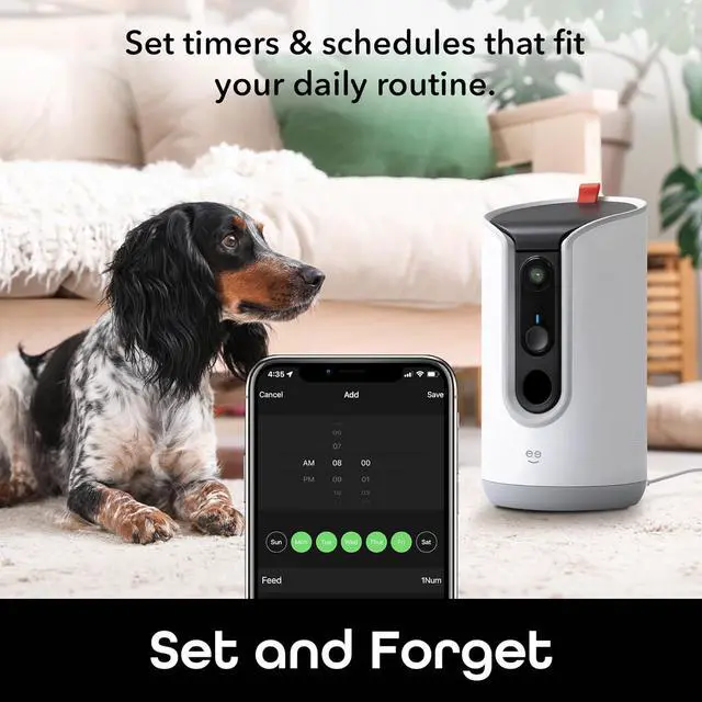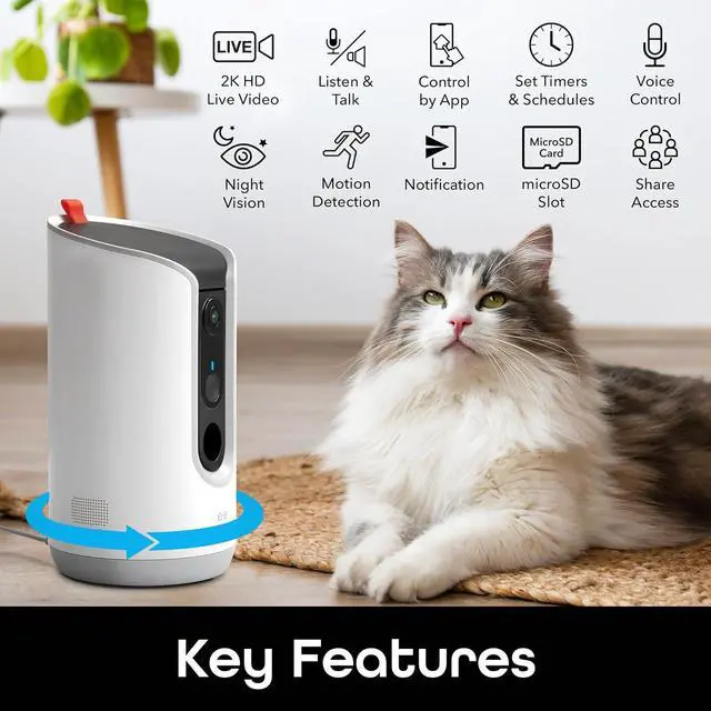 Treat Dispenser with Camera - 2K HD WiFi Enabled, Dog and Cat Automatic Smart Feeder, Two-Way Audio, Night Vision, Auto-Follow, Remote Access with App, Alexa and Google Compatible, White