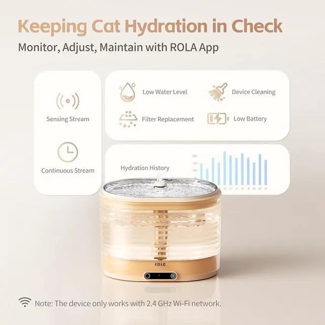 Remote Hydration Check with ROLA AppSmart pet fountain, smater pet care! Connect with the ROLA App, and monitor your cat hydration effortlessly. Check the cat water fountain situation from anywhere, ensuring your furry friend is always refreshed