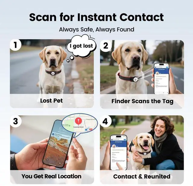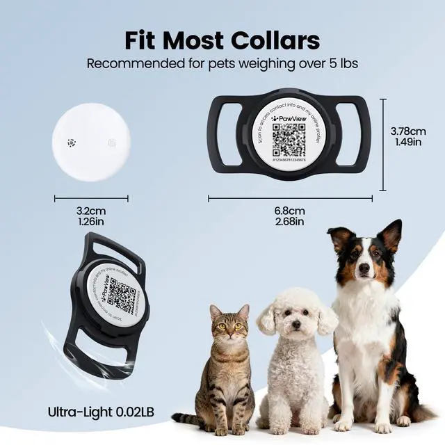 The QR tag works as a pet ID tag — it stores pet’s info, and anyone who finds your pet can scan it to call you. This tracker works with Apple Find My & Android Find Device for real-time location updates.