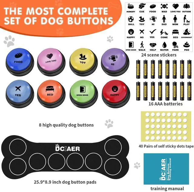 Perfect Set - 6 product accessories set, 8 ready-to-use high quality buttons + 24 scene patterns + 1 dog button pad + 12 AAA batteries + 40 double-sided stickers+Training manual. Clear sound, repeatable recording, the perfect gift set for pet toys.