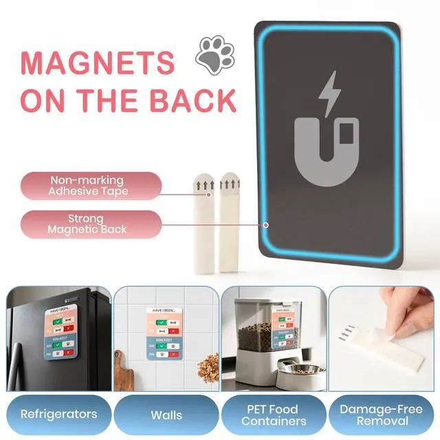 Versatile Placement OptionsStrong built-in magnet sticks to metal surfaces, or use the included adhesive to mount on walls or cabinets near your pets space.