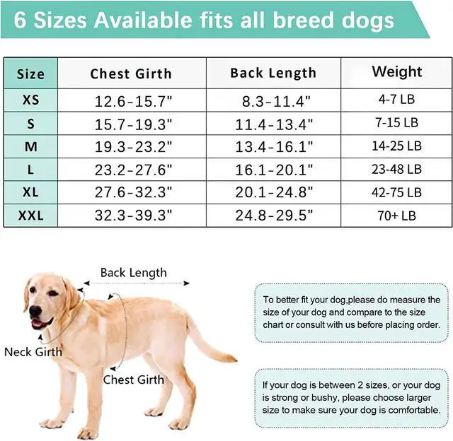 • Sizing 6 Size avaiable,XS-XXL fits for Small Medium and large dogs.To better fit your dog,please do measure the size of your dog and compare to the size chart or consult with us.