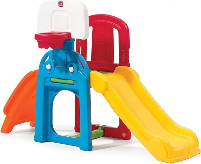 - Features a climbing ladder, slide, basketball hoop, soccer goal and toss through wall