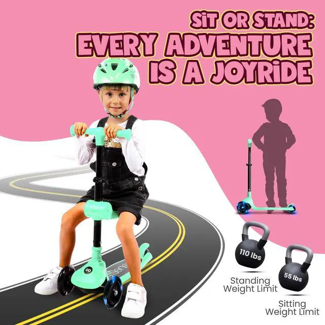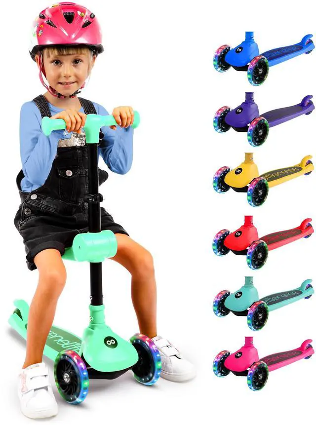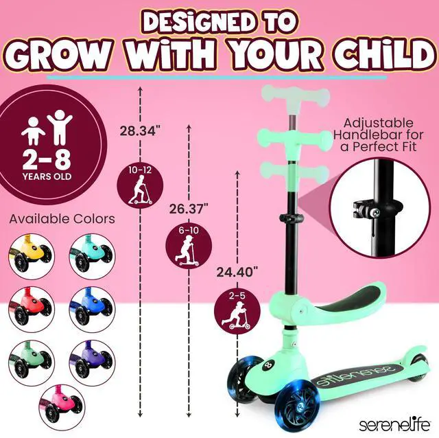 The SereneLife SLKSC23MG Foldable Kick Scooter offers smooth riding with LED light-up wheels and a fun mint green design. Its foldable seat is great for beginners, while the lean-to-steer technology builds coordination skills. This scooter is lab-tested for safety and features a non-slip deck, adjustable handlebar, and rear brake for easy control and comfort.