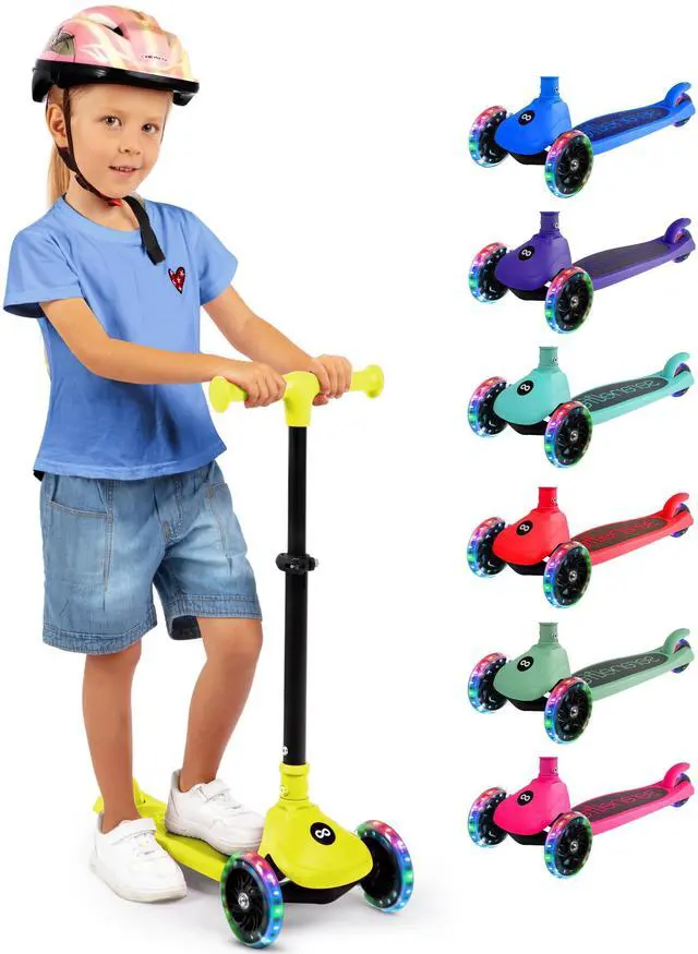 Scoot in style with the SereneLife SLKSC17YL Kick Scooter in bright yellow. This 3-wheeled ride features flashing LED wheels and lean-to-steer tech to enhance coordination. Lightweight yet durable, it includes rear foot braking, anti-slip decking, and adjustable handlebars that grow with your child. A perfect ride for kids aged 3 and up!